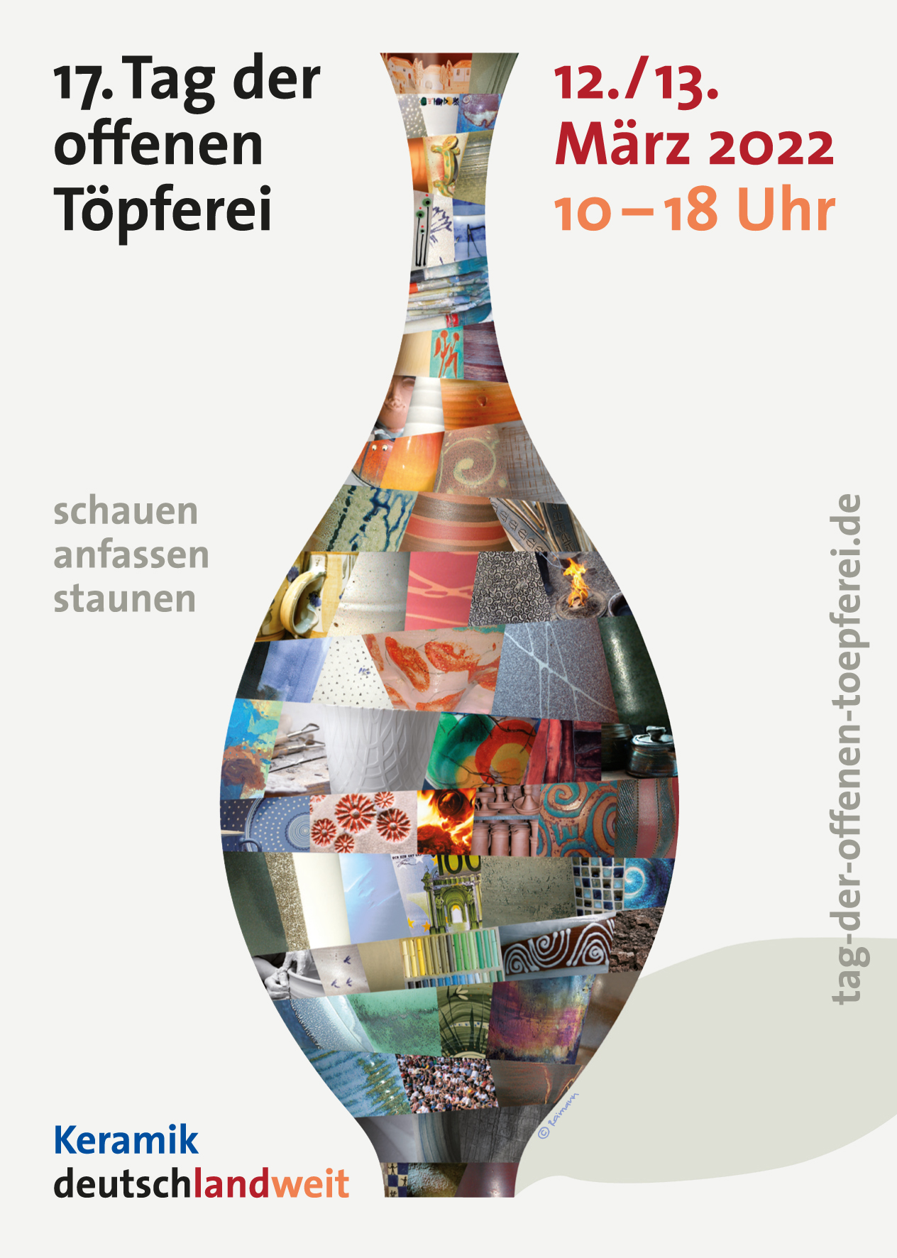 Über 500 TöpferInnen aus ganz Deutschland beteiligen sich am Samstag, den 12. und am Sonntag, den 13. März jeweils von 10 bis 18 Uhr am beliebten "Tag der offenen Töpferei". An vielen Orten mit einem abwechslungsreichen Rahmenprogramm. Die Aktion steht unter dem bekannten Motto: "SCHAUEN, ANFASSEN, STAUNEN - Keramik deutschlandweit"!
